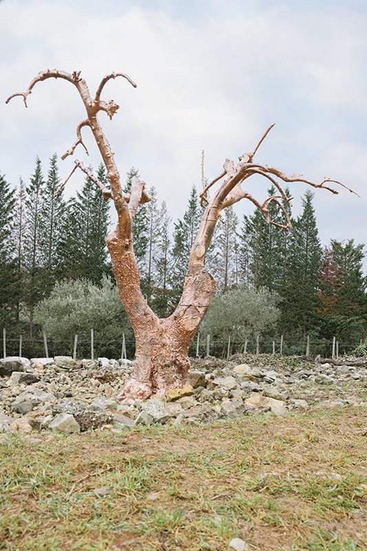 Templum is an ephemeral copper sculpture, created by electroplating from an olive tree destroyed by a bacterium that decimated many plantations in Puglia, the region of southern Italy where the artist grew up. This sculpture is destined to disappear, its material being gradually removed and reduced to copper sulphate, to be sprayed on the estate's vines, protecting them from parasites and ensuring their growth.