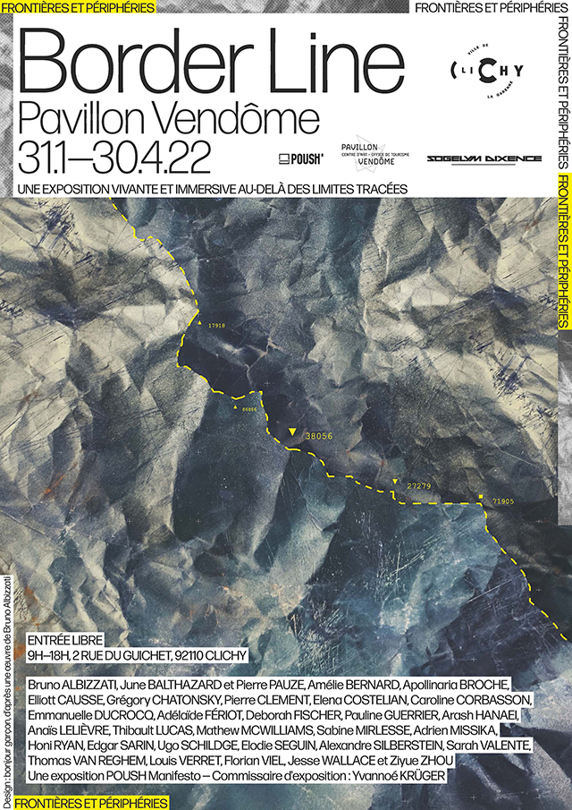 La frontière, cette entité aux trois visages – réel, symbolique, imaginaire – est donc avant tout un espace-temps d’où naîtrait la création. Pour les artistes, c’est peut-être aussi une façon de parler de Poush, ce refuge inventé pendant deux années de pandémie dans une tour de bureaux à Clichy transformée en ateliers d’artistes et se tenant à l’orée de Paris. Deux ans d’émulation artistique entre Paris et Clichy, par-delà cette ligne de goudron qu’est le périphérique.