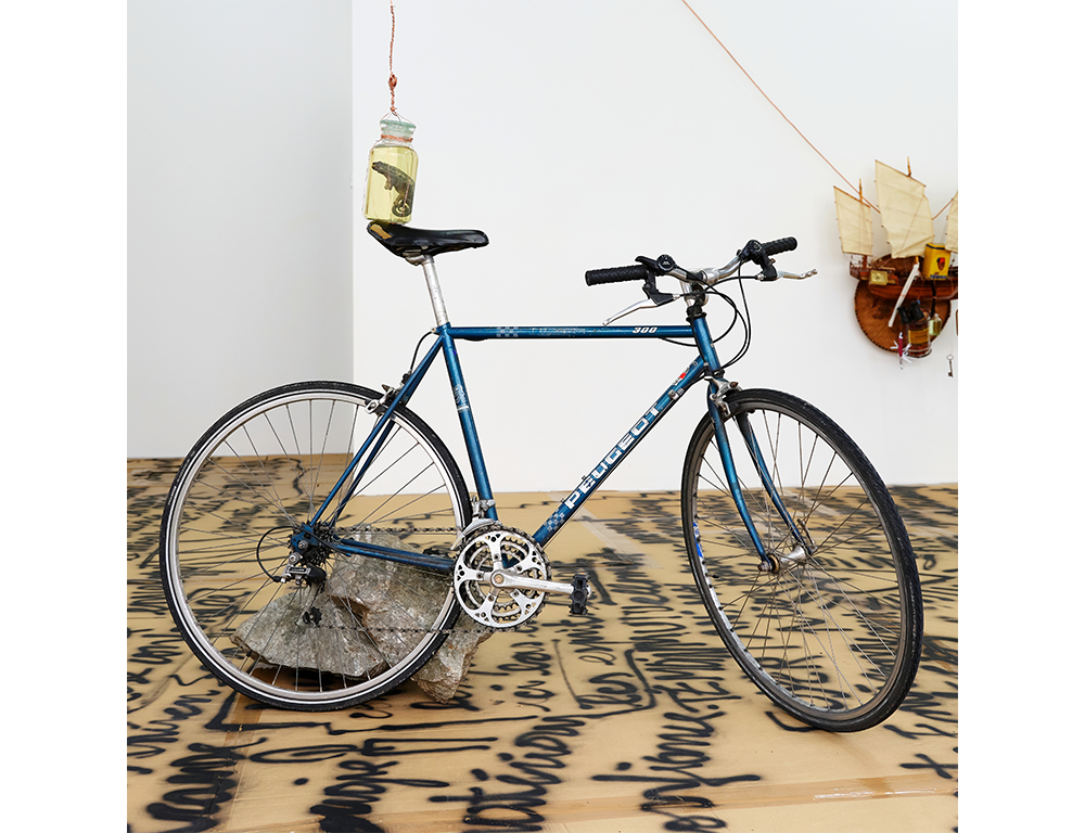 Jonathan Potana, Mouvement Primaire, Centre d'Art Ygrec - ENSAPC, 2024 Caméléon dans le formole suspendu avec fil de cuivre sur vélo et pierres, 5 x 1,3 m © Objet Pointus