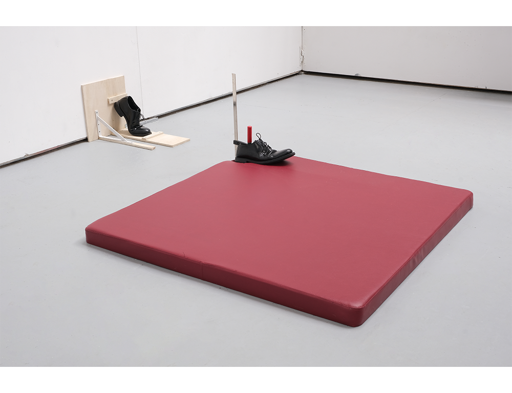 Romain Pommelet, En marche, 2023, chaussures, équerre en métal, simili-cuir, mousse, serre-joints, contreplaqué, dimensions variables
