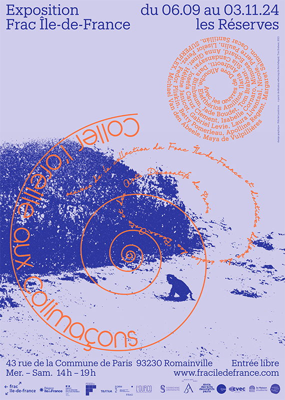 En confrontant les œuvres issues des Réserves de la collection du Frac Île-de-France à celles de jeunes artistes diplômés, on observe parfois, malgré les écarts générationnels, une convergence des sujets abordés. Inspirée des images tentaculaires que fait naître la notion « d’origine tourbillon », la scénographie de l’exposition se veut tourbillonnante. Les œuvres deviennent les fragments d’un tout en mouvement, Coller l’oreille aux colimaçons offre une immersion dans un espace où le temps se déconstruit et se reconstruit, nous invitant à réexaminer notre relation complexe avec l’histoire, la mémoire et les expériences à venir.