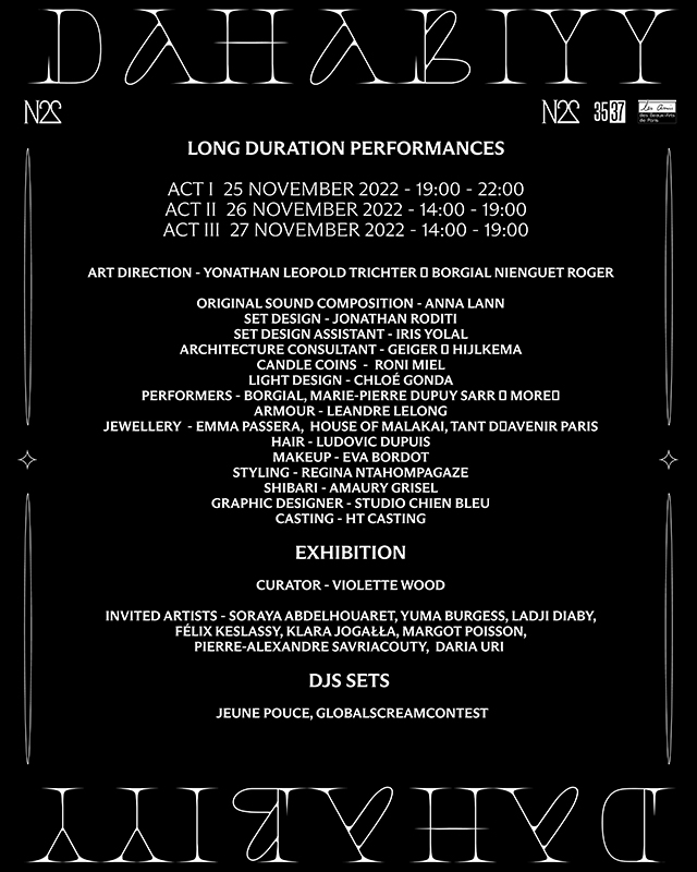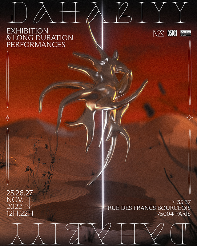 Dahabiyy est une expérience immersive qui offre un cycle de performances au sein d'un paysage mystique. C'est l'occasion de mettre en lumière le travail d'un large réseau de créatifs émergents basés à Paris. Les pièces célèbrent la renaissance des sociétés proto-utopiques en réveillant nos imaginaires spirituels collectifs.