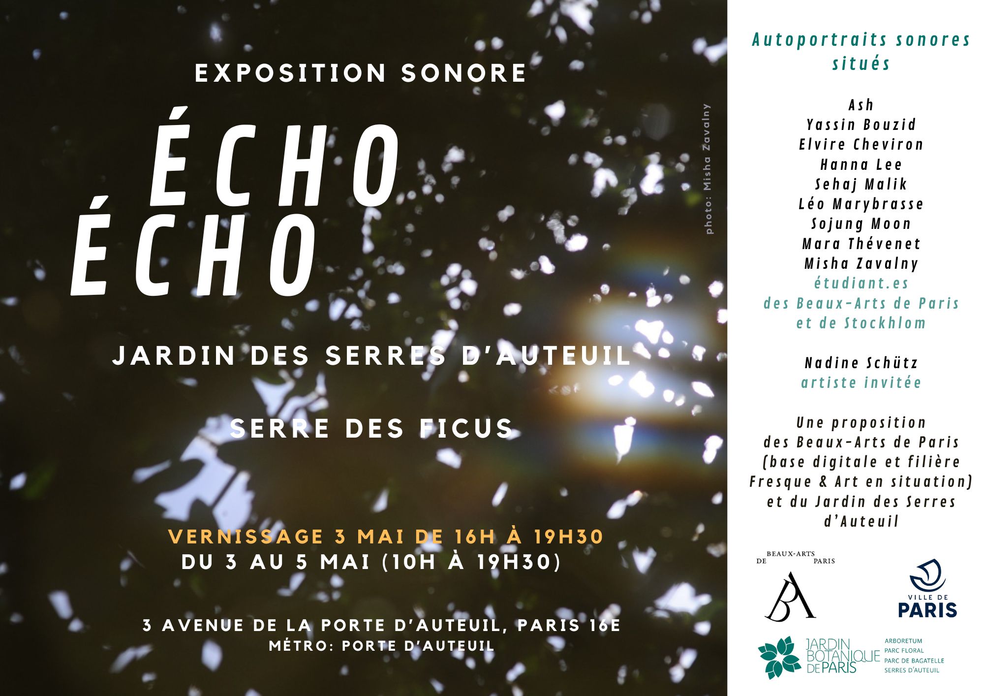 (((écho écho))) est une exposition sonore "située", composée de 9 autoportraits créés en miroir avec les plantes du jardin et des serres d’Auteuil par des étudiant·es des Beaux-Arts de Paris et de Stockholm, accompagné·es par l’artiste Nadine Schütz.