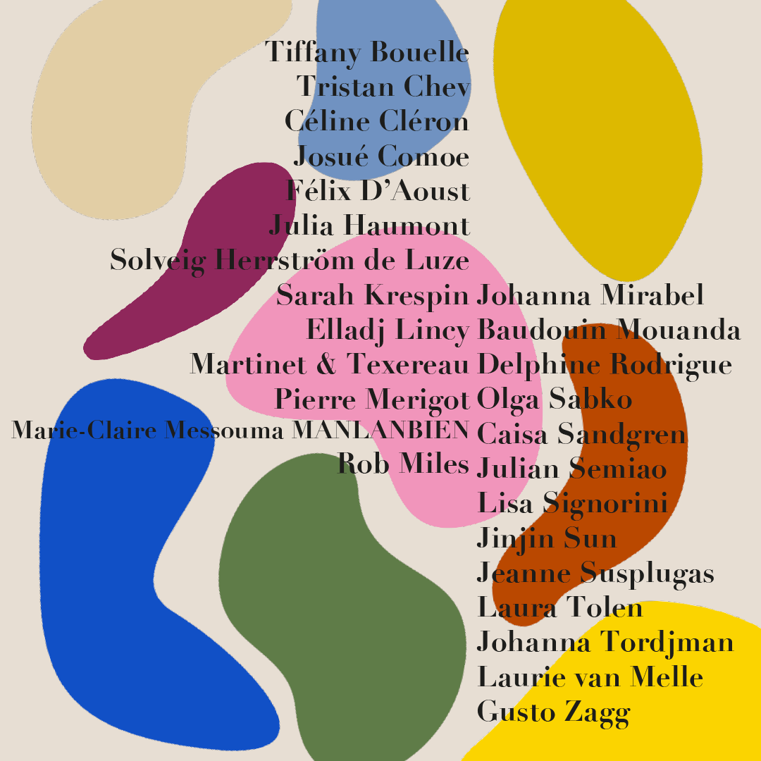 Tiffany Bouelle, Tristan Chev, Céline Cléron, Josué Comoe, Félix D’Aoust, Julia Haumont, Solveig Herrström de Luze, Sarah Krespin, Elladj Lincy, Martinet & Texereau, Pierre Merigot, Marie-Claire Messouma MANLANBIEN, Rob Miles, Johanna Mirabel, Baudouin Mouanda, Delphine Rodrigue, Olga Sabko, Caisa Sandgren, Julian Semiao, Lisa Signorini, Jinjin Sun, Jeanne Susplugas, Laura Tolen, Johanna Tordjman, Laurie van Melle, Gusto Zagg.