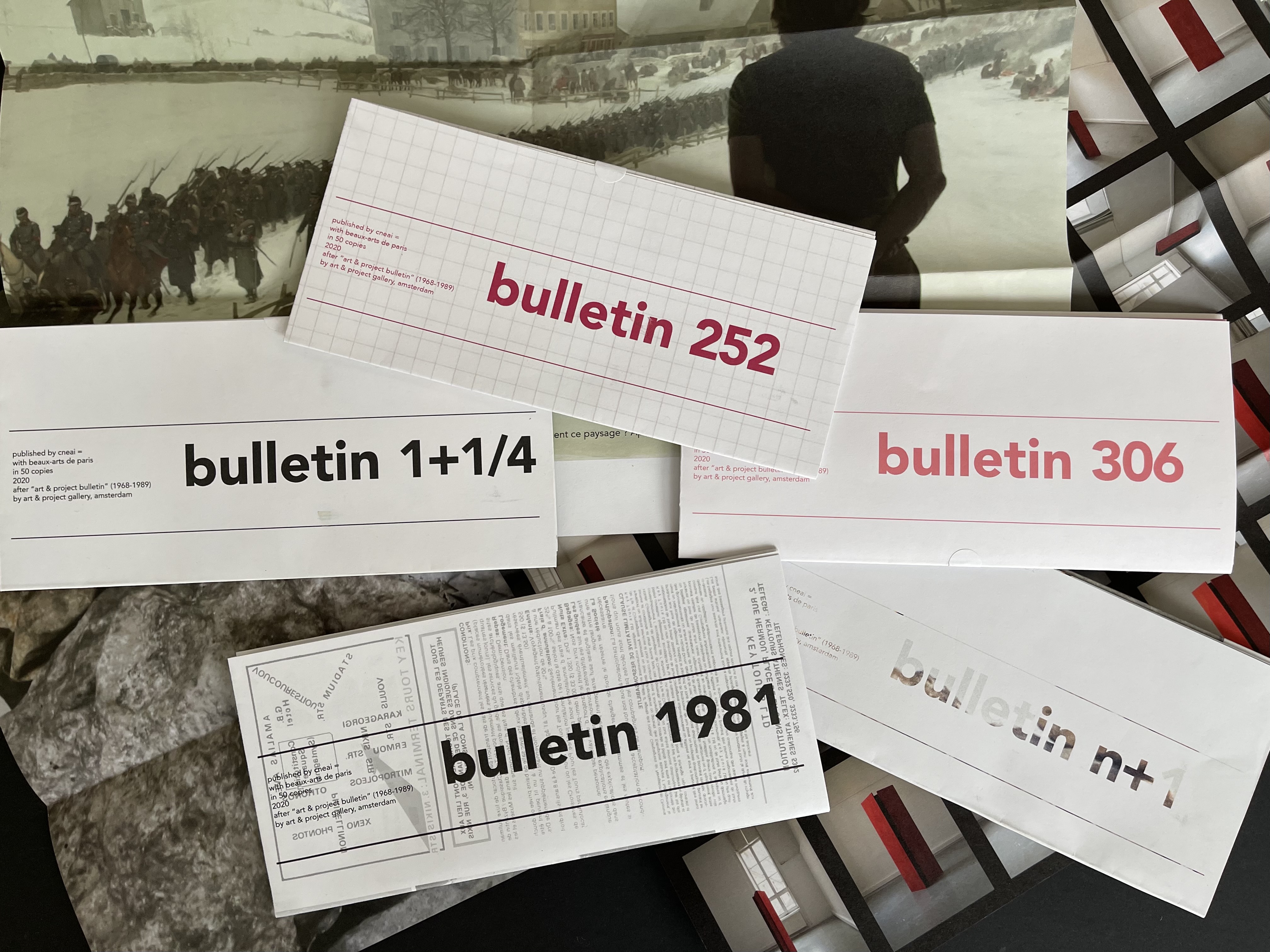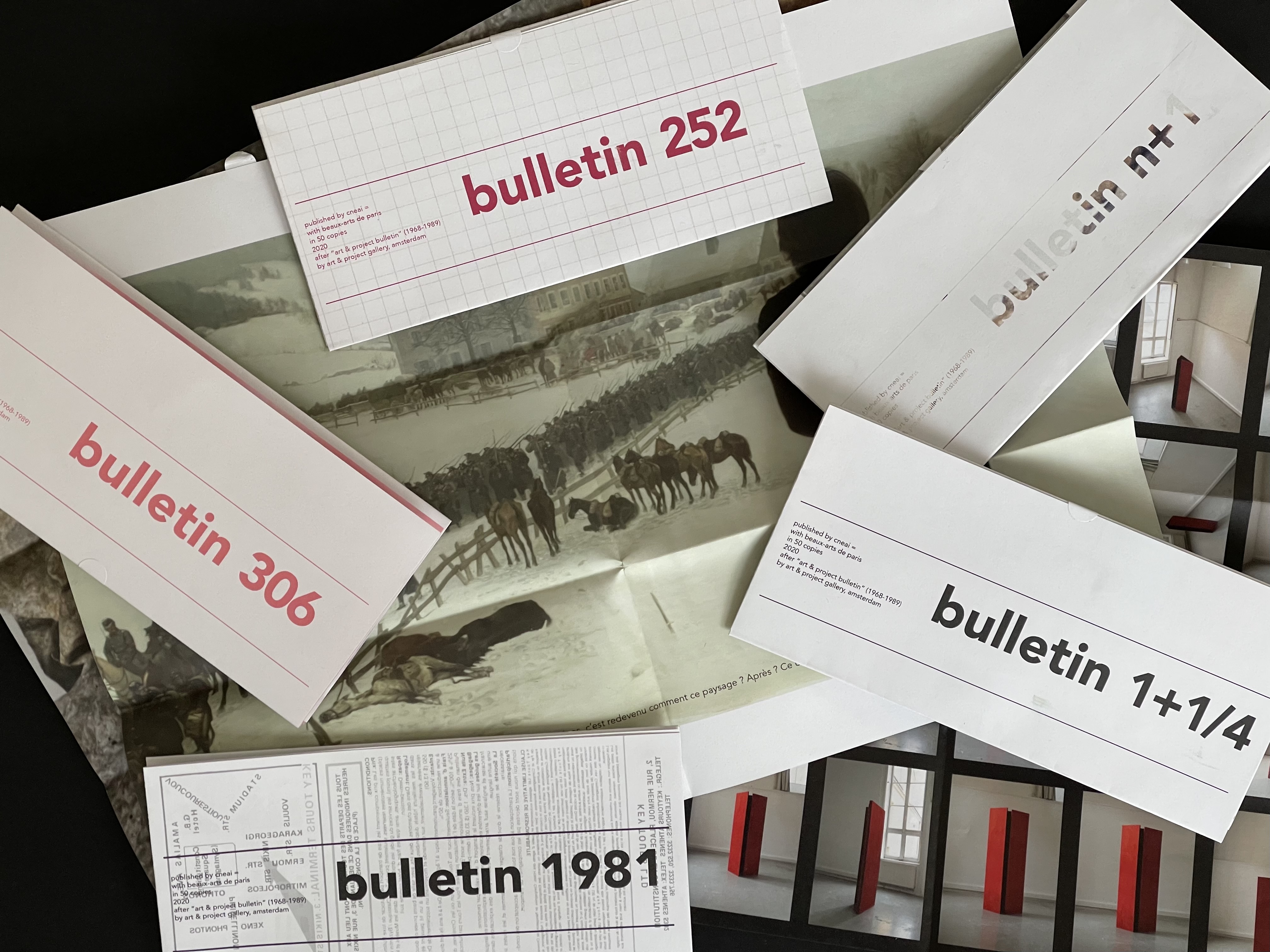 Ces bulletins ont été édités en 50 exemplaires : une poursuite-hommage de art & project bulletin, aventure éditoriale menée de 1968 à 1989, par Geert van Beijereen et Adriaan van Ravestjein (galerie art & project, Amsterdam).