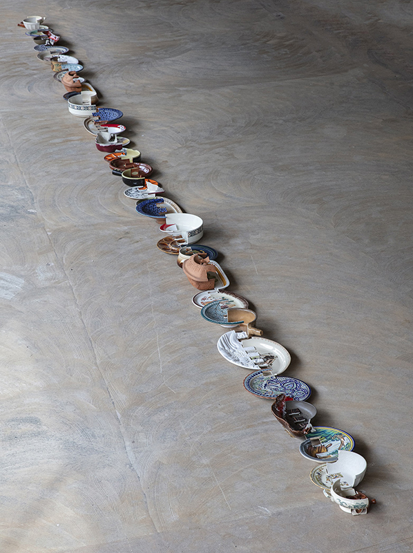 Le Café Transversal de Javier Carro Temboury consiste en une série de rencontres, de discussions à table qui viendront structurer la durée de la résidence. Comme témoin de celles-ci, apparaitra la pièce centrale de l’exposition, un ensemble de dalles où on pourra percevoir, à travers quelques lignes abstraites, la vaisselle restante figée dans le béton.