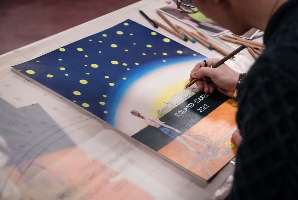 "Quand on m’a proposé de faire cette affiche, un souvenir m’est revenu. J’avais un ami au collège qui pratiquait beaucoup le tennis et regardait souvent Roland-Garros. Je ne jouais pas au tennis mais il m’a partagé sa passion. C’est à ce moment-là que j’ai commencé à m’y intéresser, à découvrir Nadal et Federer. Ce que je trouvais très beau, c’était les étoiles qu’il avait dans les yeux lorsqu’il parlait de ces joueurs. Cela a été ma première inspiration, explique l’artiste. Quand j’ai visité le stade, je me suis aussi rendu compte de la passion des gens qui regardent le tennis. Je trouve que c’est beau à voir. Je pense qu’il y a peu de public dans le sport aussi passionné que celui du tennis. Quand j’ai réalisé cette affiche, j’ai surtout pensé aux enfants dans les clubs, avec l’idée de leur donner envie d’aller plus loin dans leur sport."