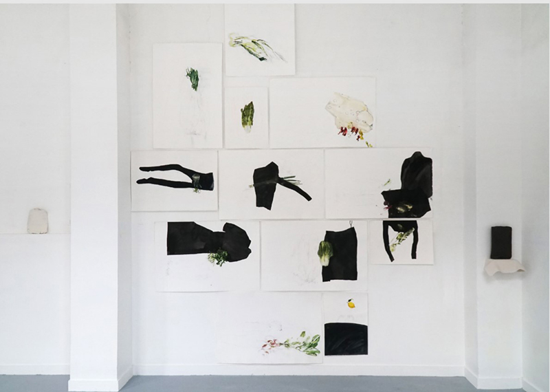 Manon Gignoux, Corps, ombres, légumes, aquarelle, encre et carbone, 80 x 120 cm chacun, 2019