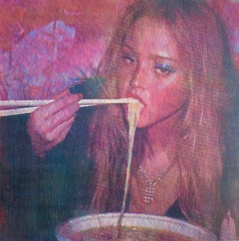 Devon Aoki eating noodles subjectively for Vogue Japan. Woodcut on paper (4 colors). 40 x 40 cm. 2021