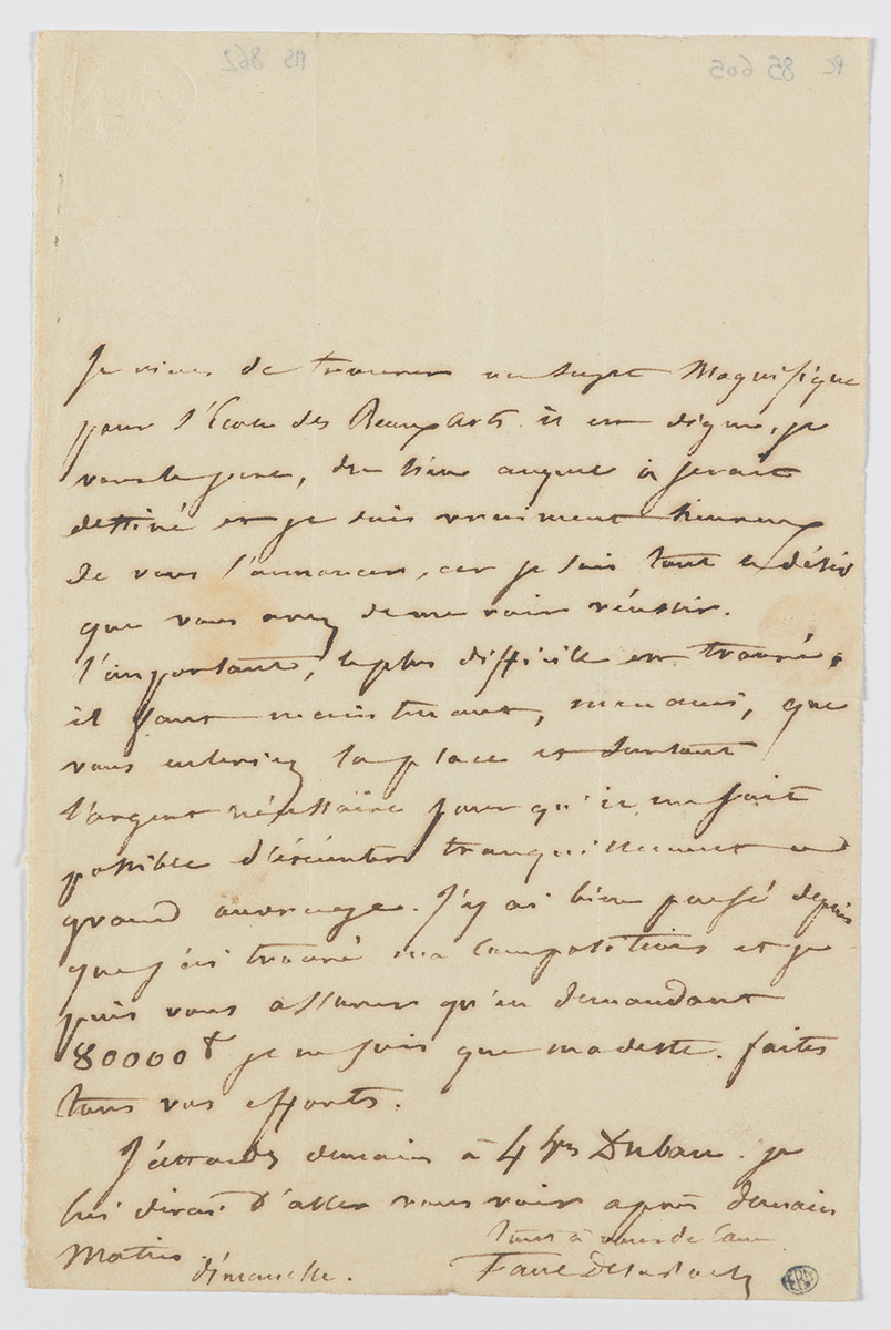 « Je viens de trouver un sujet magnifique pour l’Ecole des Beaux-Arts. Il est digne, je vous le jure, du lieu auquel il serait destiné et suis vraiment heureux de vous l’annoncer car je sais tout le désir que vous avez de me voir réussir. L’important, le plus difficile est trouvé, il faut maintenant, mon ami, que vous enleviez la place et surtout l’argent nécessaire pour qu’il me soit possible d’exécuter tranquillement ce grand ouvrage. J’y ai bien pensé depuis que j’ai trouvé une composition et je puis vous affirmer qu’en demandant 80 000 F je ne suis que modeste. Faites tous vos efforts. J’attends demain à 4 heures Duban. Je lui dirai d’aller vous voir après demain matin. Tout à vous. Paul Delaroche », lettre autographe sans doute adressée à son ami, M. Le Blanc, au sujet de la fresque murale de l’amphithéâtre d’honneur des Beaux-Arts de Paris, mars 1836, in-8°, Ms 862