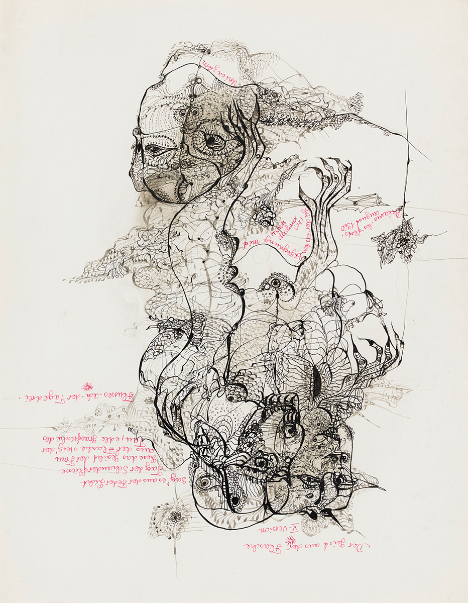 Ce dessin laissé à l’état de manuscrit fait partie, comme l’indique l’inscription située dans la partie supérieure, du tome V de l’Oracles et spectacles, également entré dans la collection. Datée d’août 1960 et localisée à Palavas-les-flots, cette feuille est à mettre en relation, comme Zürn le précise, avec sa première rencontre avec Henri Michaux en 1957. Lors de son internement à l’hôpital Sainte-Anne en 1961, il lui offre un cahier d’écolier portant comme dédicace « Cahier de blanches étendues intouchées/Lac où les désespérés, mieux que les autres/Peuvent nager en silence, / S’étendre à l’écart et revivre » et dans lequel elle poursuit pendant plusieurs années son œuvre dessiné.