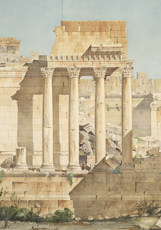 Célébré pour son gigantisme, Baalbek séduit par l’originalité de son architecture gréco-romaine enrichie d’éléments sémitiques et orientaux. Les séjours de Joyau et de Redon, qui varient entre cinq et dix mois, leur permettent de dresser un état précis des monuments antiques à travers de superbes relevés aquarellés. Leurs dessins rendent compte avec une fidélité scrupuleuse de la beauté de ces ruines entourées de hautes murailles, mais aussi de l’environnement aride qui les entoure avec à l’arrière-plan les hautes montagnes de l’Anti-Liban.