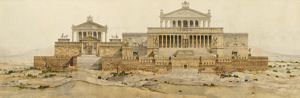Joseph-Louis-Achille Joyau (1831 – 1873) Temple d’Héliopolis, état actuel, façade principale Graphite, plume, encre noire et aquarelle sur papier entoilé, 0,6 x 1,4 m