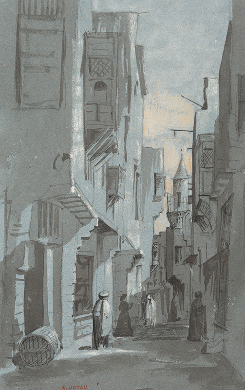 Joseph-Louis-Achille Joyau (1831 – 1873) Rue au Caire Pierre noire, lavis d’encre de Chine, rehauts de gouache blanche et beige sur papier bleu, 0,35 x 0,23 m