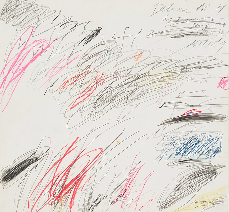 Cy Twombly, Delian Ode n°19, août 1961 Craie grasse, crayon, crayon de couleur et stylo à bille sur papier, 33,3 x 35,3 cm Collection privée, Paris / Dépôt à la Collection Lambert, Avignon © Cy Twombly Foundation