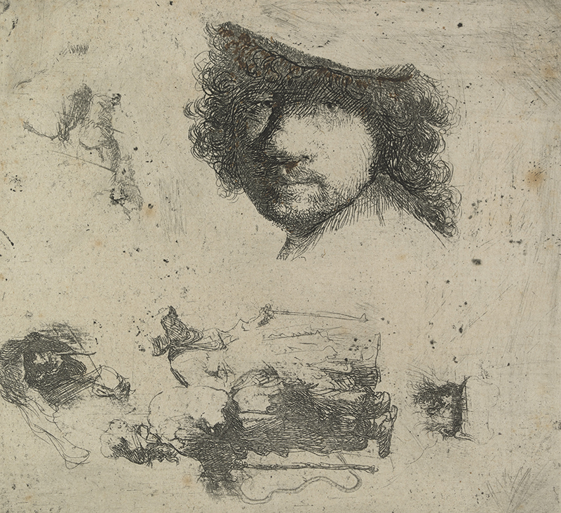 Rembrandt, Griffonnements avec la tête de Rembrandt, Portrait, 1632 Gravure sur cuivre © Beaux-Arts de Paris