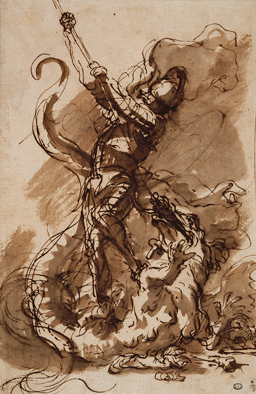 Salvator Rosa (1615-1673) Saint Georges terrassant le dragon Plume, encre brune et lavis brun © Beaux-Arts de Paris