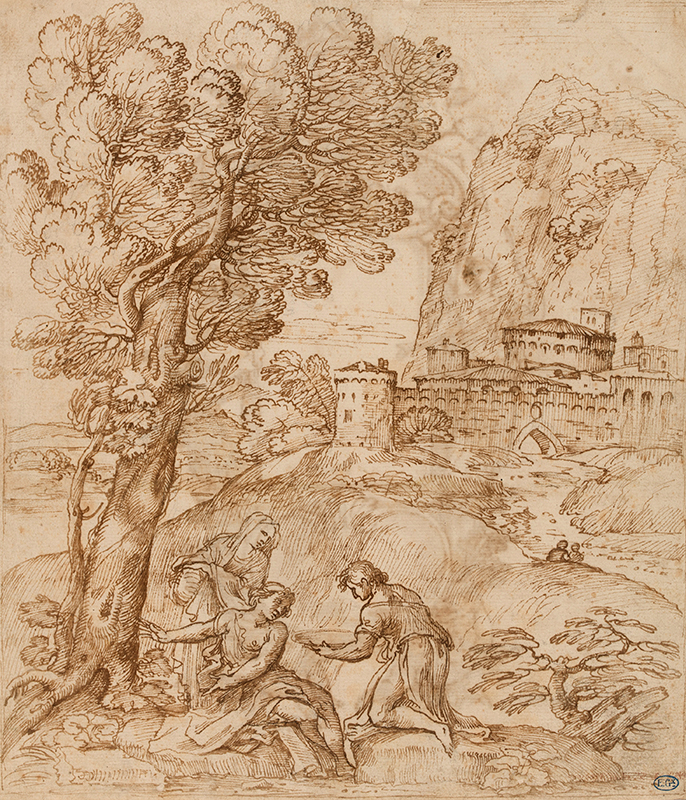 Giovanni Francesco Grimaldi (1606 – 1680) Paysage avec un personnage secouru par deux personnes au pied de l’arbre du premier plan Plume, encre brune Provenance : E. Gatteaux ; legs en 1883 aux Beaux- Arts de Paris © Beaux-Arts de Paris