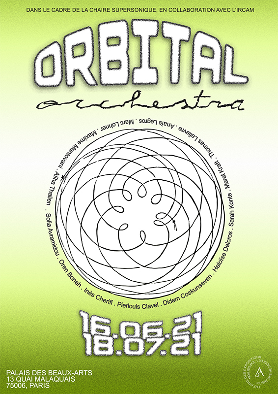 Dans le cadre de la chaire « Supersonique : exposer, monter, habiter le son », les étudiants des Beaux-Arts de Paris ont pu collaborer avec des compositeurs de l’Ircam pour composer ensemble des oeuvres sonores et visuelles et ainsi imaginer une exposition collective, Orbital Orchestra. Cette collaboration prend la forme d’une partition numérique activée par un dispositif sonore central, imaginé collectivement et programmé par les réalisateurs en informatique musicale de l’Ircam.