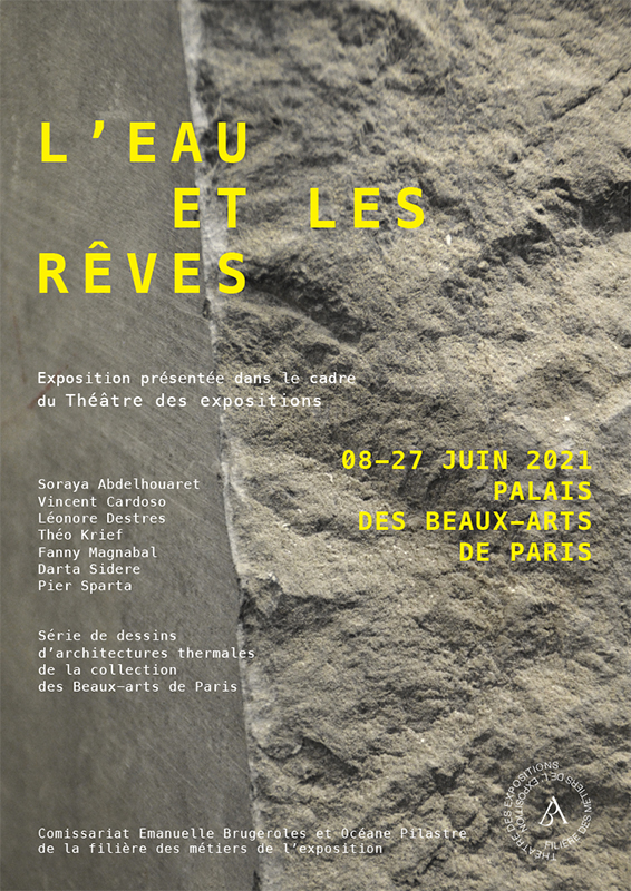 L’eau et les rêves s’abreuve de l’oeuvre littéraire de Gaston Bachelard et de sa pensée sur la « morale de l’eau ». L’exposition nage, voire dérive, au milieu d’une sélection d’esquisses peintes par les étudiants des Beaux-Arts de Paris au 19e siècle. Ces architectures thermales caractéristiques des programmes de l’École sous le second Empire reflètent la « fièvre thermale » qui se répand au même moment sur le territoire français avec l’apparition de villes d’eaux à proximité et au coeur des massifs montagneux. Au centre de ces bâtiments imaginaires, les sculptures des étudiants du Laboratoire Matière/Espace sont comme des fragments d’architecture baignés dans des eaux aquarellées. Elles témoignent de l’existence possible d’un monde émergeant au croisement de deux siècles. Chacune à sa manière évoque en songe le souvenir d’un lieu, d’un moment ou d’une sensation : un passage en forêt, une baignade, des pierres chaudes, de l’eau et des rêves.