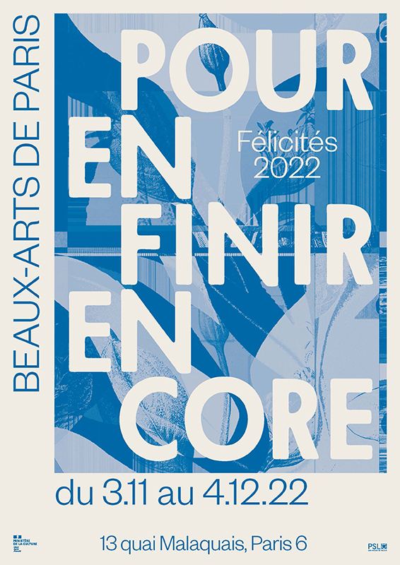 Pour en finir encore* présente les dix-huit artistes qui ont obtenu leur diplôme national supérieur d'arts plastiques des Beaux-Arts de Paris avec les Félicitations du jury. L'exposition, proposée par la commissaire Béatrice Josse, rend compte de la générosité et de l'économie de moyens qui caractérisent les pièces réalisées par les artistes Félicités en 2022. La modestie des matériaux rime avec la puissance des gestes et des intentions d'une génération contrainte à la réparation. Une ode au collectif à l’heure des replis identitaires et des conflits dans le monde ; l'exposition redonne sens et espoir en des lendemains qui chantent. Après deux années hors-les-murs, l'exposition des Félicités reprend place dans les grandes salles du Palais des Beaux-arts et offre un dialogue avec l'histoire prestigieuse du site.