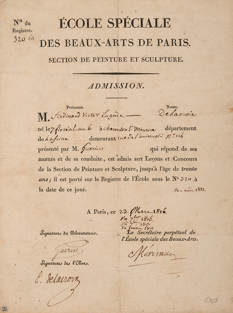 Eugène Delacroix, Formulaire d’inscription d’Eugène Delacroix aux Beaux-Arts de Paris, mars 1816, papier © Beaux-Arts de Paris