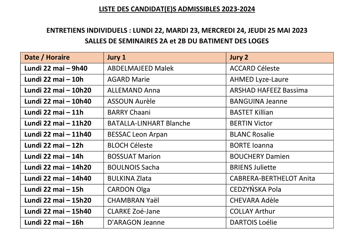 Les candidat(e)s admissibles sont invité(e)s à se présenter aux oraux d’admission aux dates et horaires indiqués dans la liste ci-dessous. Ces entretiens se dérouleront aux beaux-arts de Paris (14 rue Bonaparte, 75006) dans les salles de séminaires 2A et 2B du bâtiment des Loges. Ils dureront vingt minutes par candidat(e).