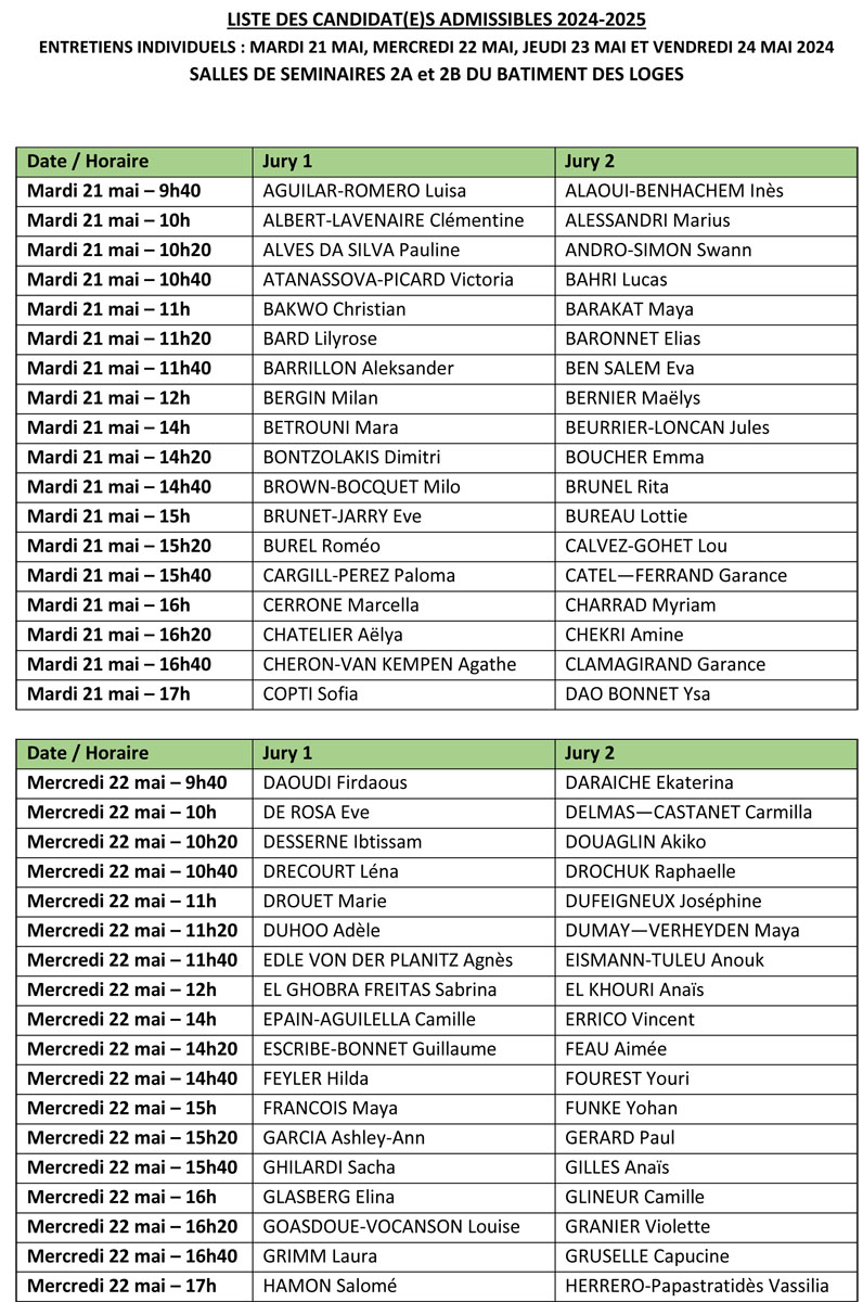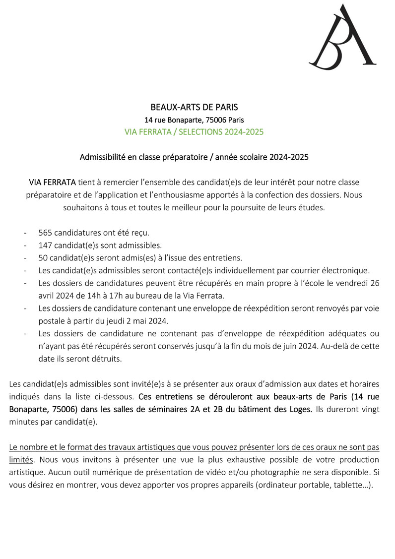 Les candidat(e)s admissibles sont invité(e)s à se présenter aux oraux d’admission aux dates et horaires indiqués dans la liste ci-dessous. Ces entretiens se dérouleront aux beaux-arts de Paris (14 rue Bonaparte, 75006) dans les salles de séminaires 2A et 2B du bâtiment des Loges. Ils dureront vingt minutes par candidat(e).
