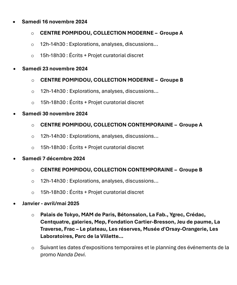 Tous les samedis, les cinquante étudiantes et étudiants de VIA FERRATA réparti(e)s en deux groupes se retrouvent alternativement devant un musée, un centre d’art, une collection privée d’art moderne ou contemporain pour une visite d’exposition avec Daphné Brottet.