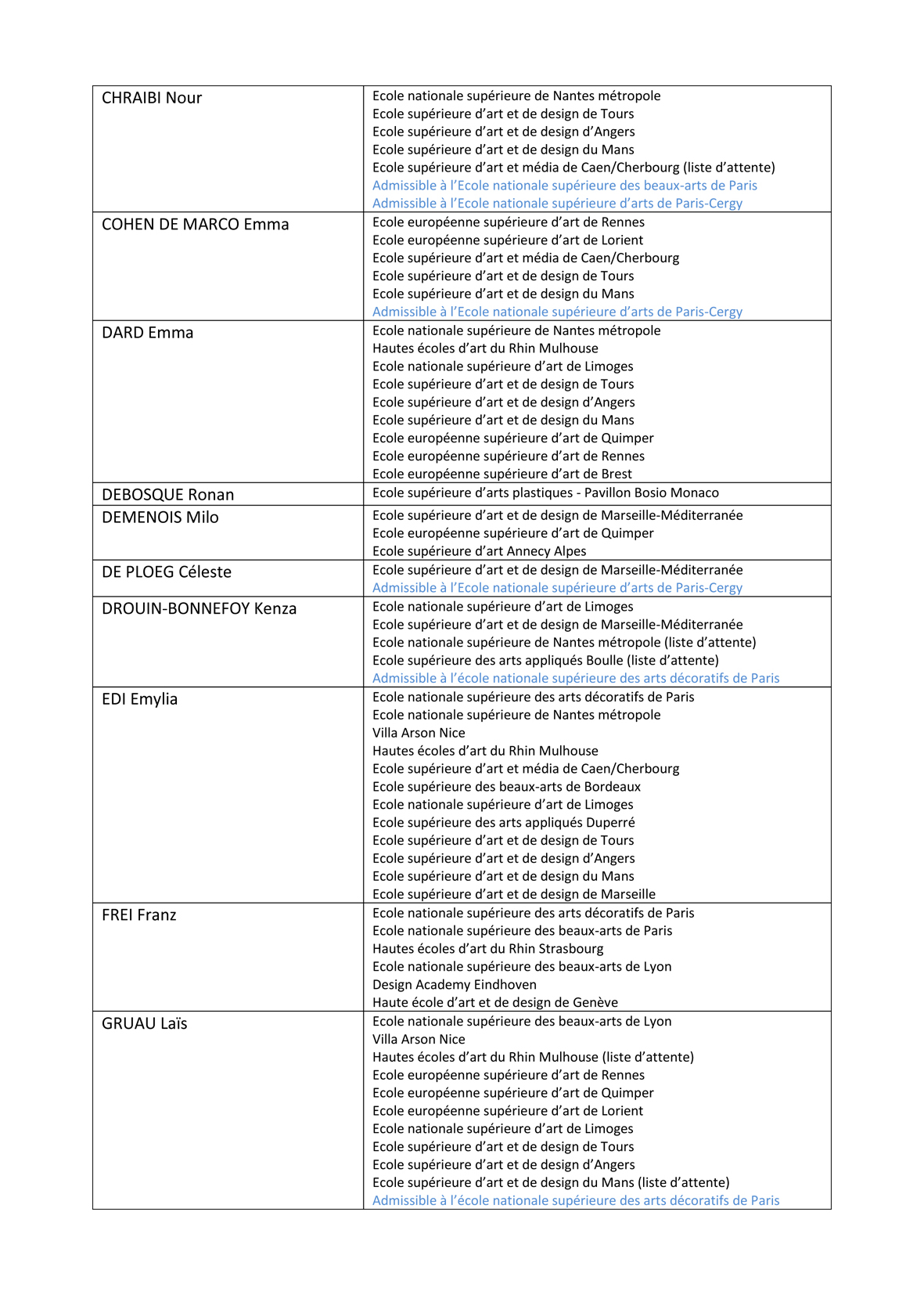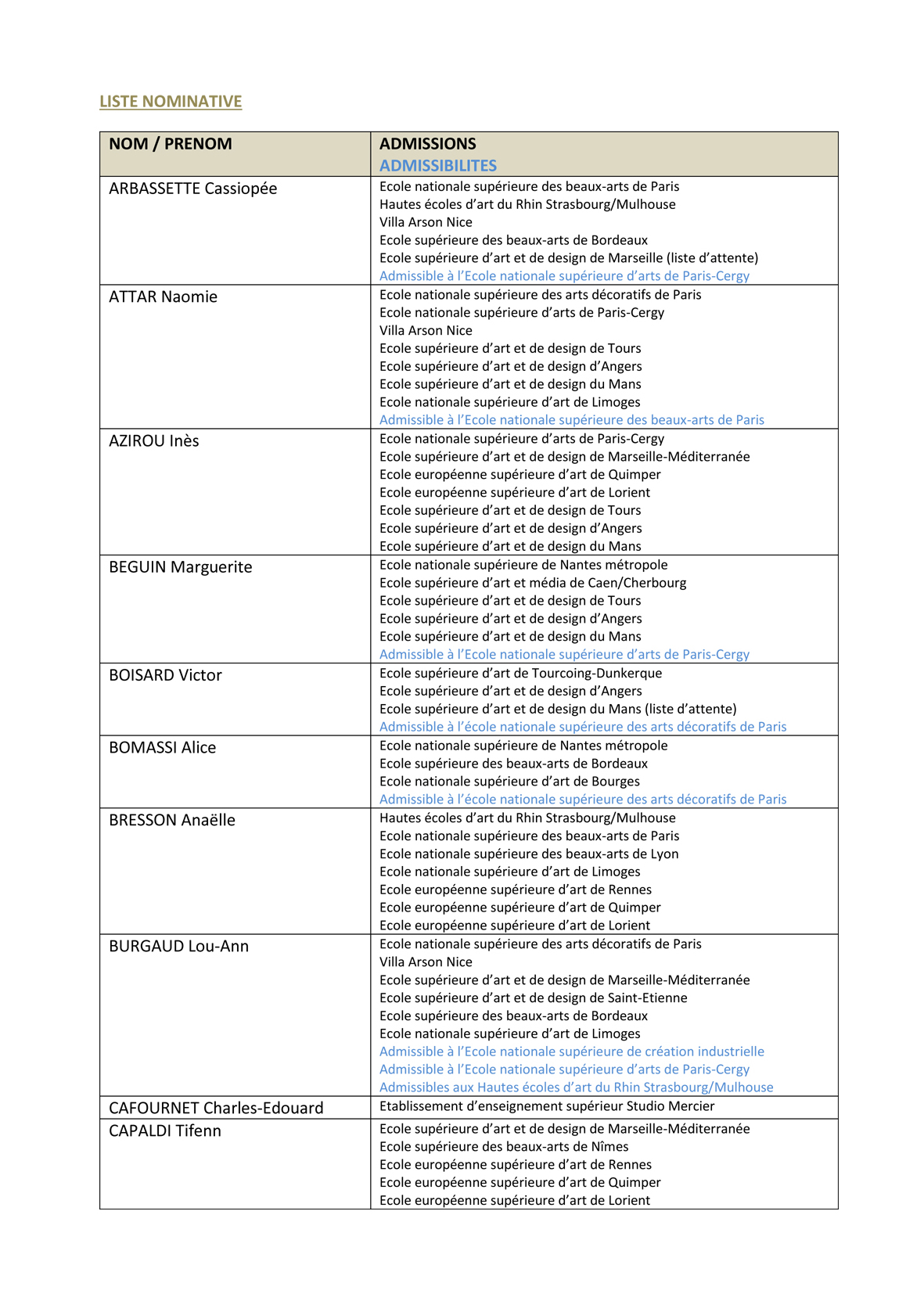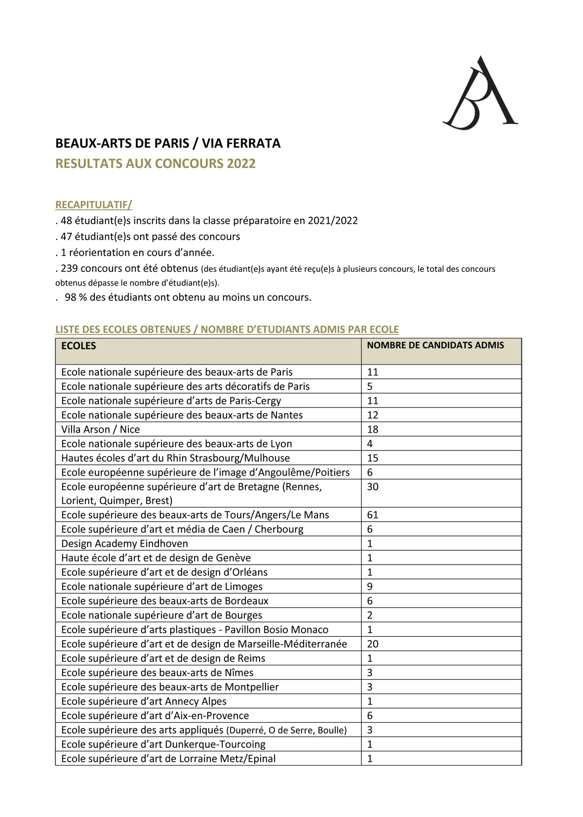 En cette fin d'année scolaire, voici les résultats des concours obtenus par nos étudiantes et étudiants de cette année. Parmi cette promotion 2021/2022 (promotion CHOGORI), 98% des étudiantes et étudiants ont réussi à intégrer une école supérieure d’art. 239 concours ont été réussi. Bravo à toutes et à tous!