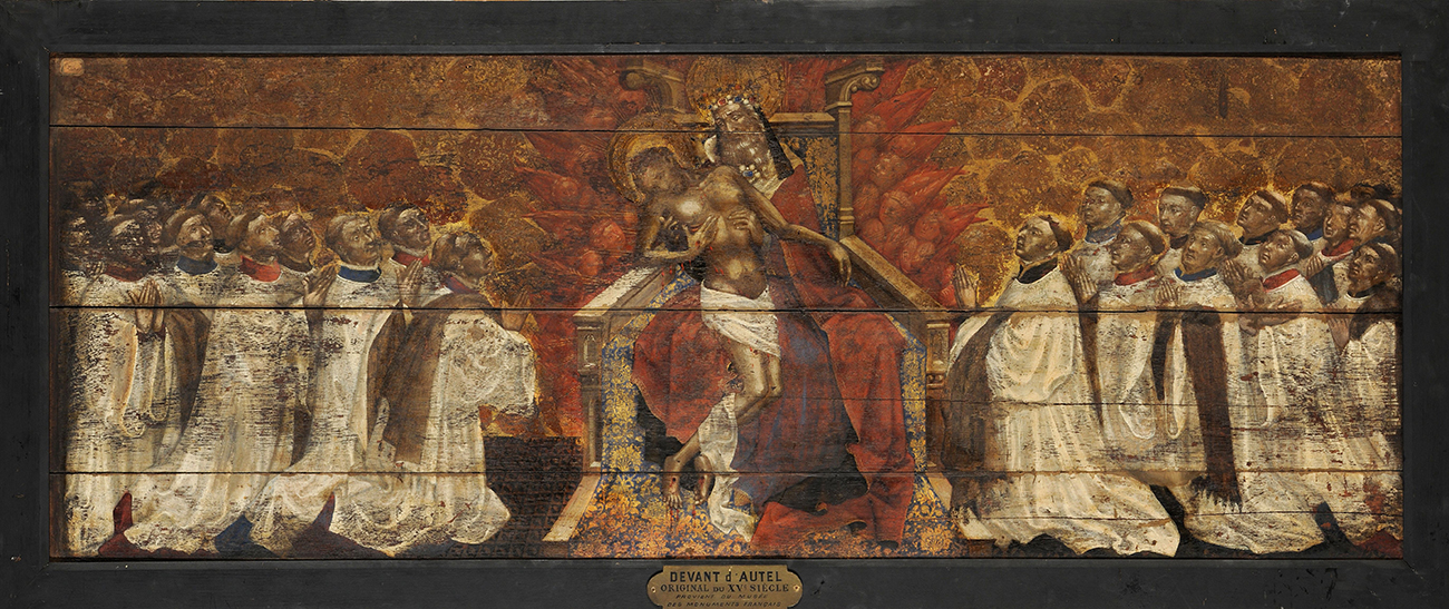 Maître de Dunois, La Trinité souffrante entourée de chanoines de Notre-Dame de Paris, XVe siècle, Pigment sur panneau de chêne, 68 x 179 cm