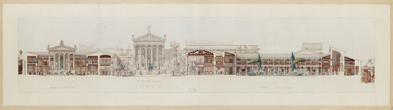 Léon Jausselly, Forum de Pompéi, grande coupe transversale, Graphite, Plume, encre brune, aquarelle, 1910, H. 53,3 ; L. 81