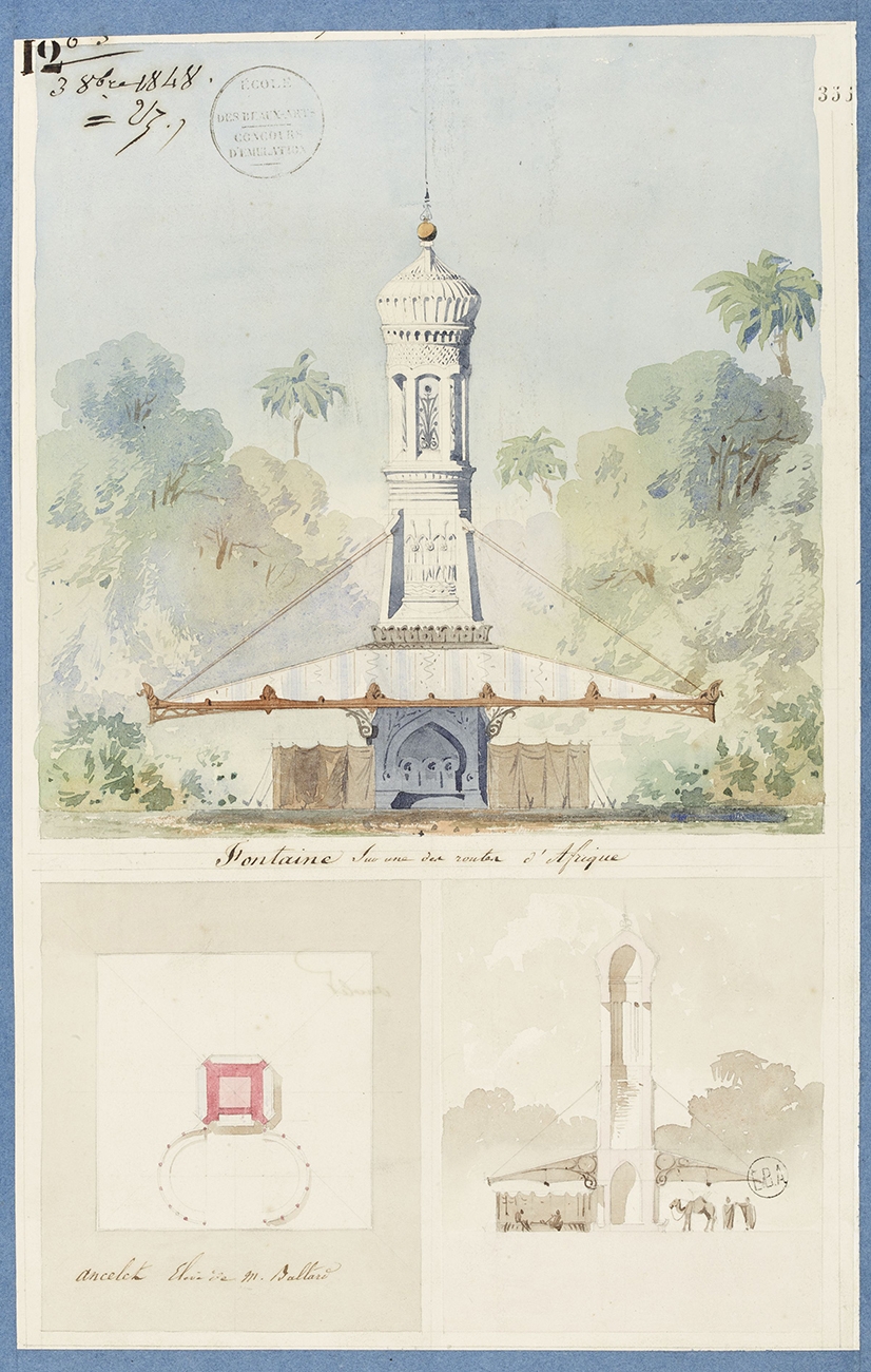Gabriel-Auguste Ancelet, Fontaine sur une des routes d’Afrique, Graphite, plume, encre noire et aquarelle, 1848, H.78,5 ; L. 61,5