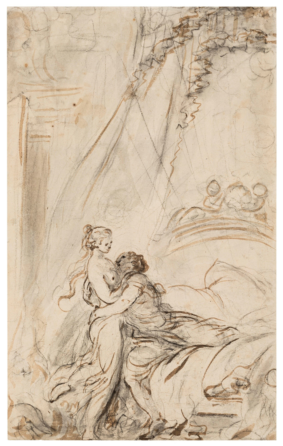 Alcine retrouve Roger dans sa chambre, vers 1780 Pierre noire et lavis de bistre, 38,5 x 23,5 cm © Beaux-Arts de Paris, EBA 11197